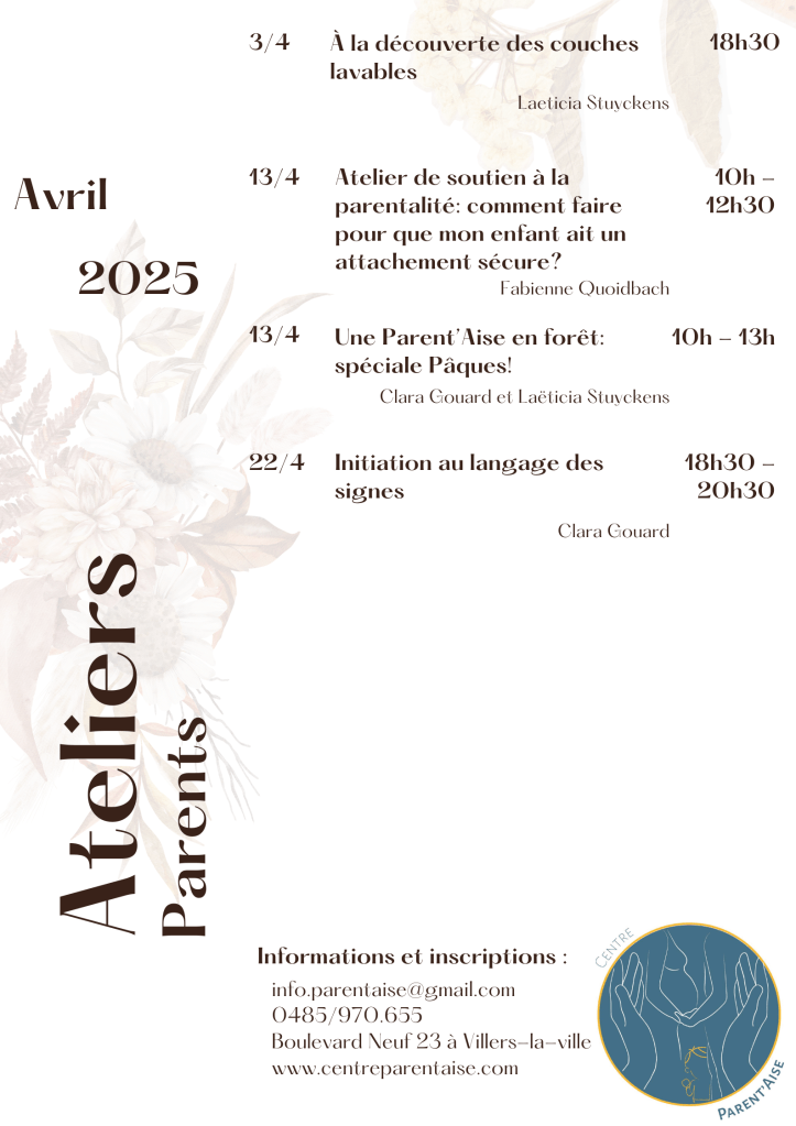 Nous sommes également heureuses de vous annoncer notre prochaine Parent’Aise en forêt, notre journée familiale, le dimanche 13 avril de 10h à 13h pour une édition spéciale Pâques!