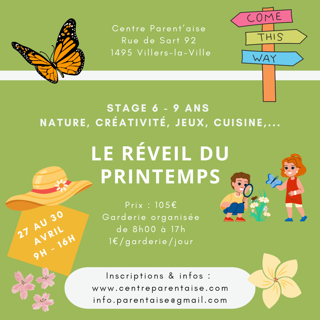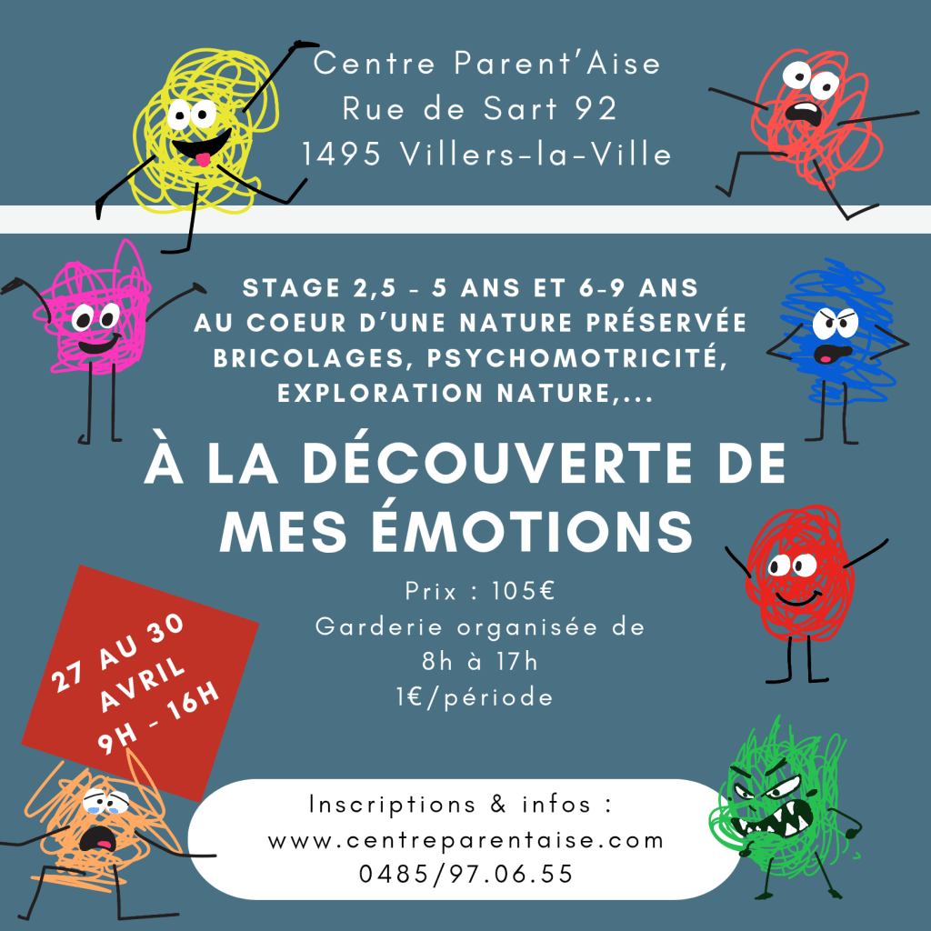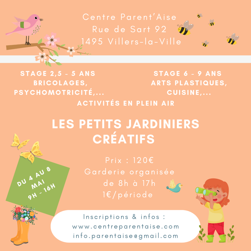 Nos stages Un stage cosy et familial au cœur d’une nature préservée Réserver une activité ou un stage ← RetourMerci pour votre réponse. ✨ Organisés par nos professionnelles, le centre Parent’Aise propose des stages pour vos enfants dès 2,5 ans jusqu’à 9 ans dans un cadre sécurisant et en petit groupe. Stage de printemps du 27 au 30 avril 2026 Groupes 2,5-5 ans et 6-9 ans Stage de créativité, nature, psychomotricité et cuisine Horaire: 9h-16h (garderie de 8h à 17h) Tarif: 105€ (+1€ par période de garderie) Stage de printemps du 27 au 30 avril 2026 Petits groupes de 2,5-5 ans et 6-9 ans Stage de créativité, nature, psychomotricité et cuisine Horaire: 9h-16h et garderie de 8h à 17h (1€/garderie) Prix: 120€ Annulation ? En cas d’annulation un mois avant le début du stage, celui-ci vous sera remboursé intégralement. Dans le cas contraire, 30 euros seront conservés afin de préserver une qualité d’organisation et couvrir les frais administratifs. En cas de maladie de l’enfant pendant le stage, les jours non prestés et couverts par un certificat médical seront reportés sur un autre stage dans un délais d’un an. Contactez-nous Name(obligatoire) Email(obligatoire) Votre message: Envoyer!Envoi du formulaire Δ Partager : Partager sur X(ouvre dans une nouvelle fenêtre) X Partager sur Facebook(ouvre dans une nouvelle fenêtre) Facebook J’aime chargement…